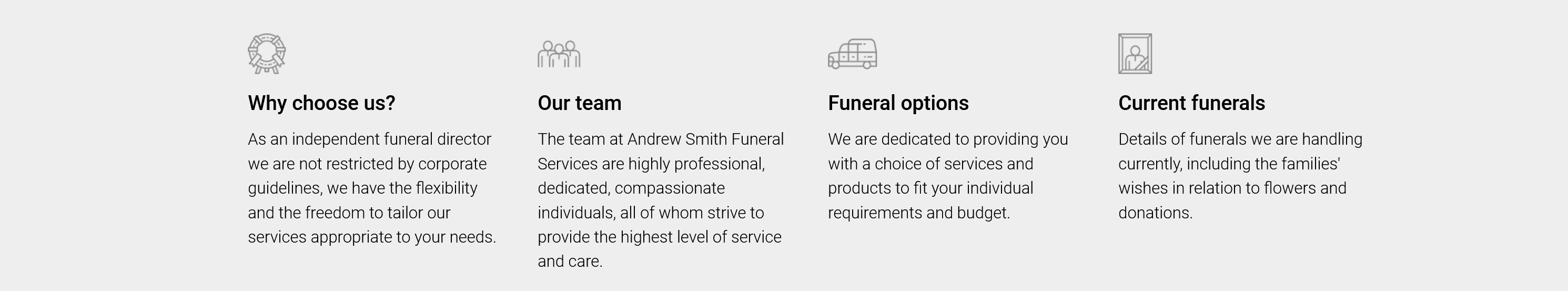 At Andrew Smith Funeral Services, we work hard to provide our services to you in a sensitive, courteous and highly professional manner, taking into account any religious and cultural needs.